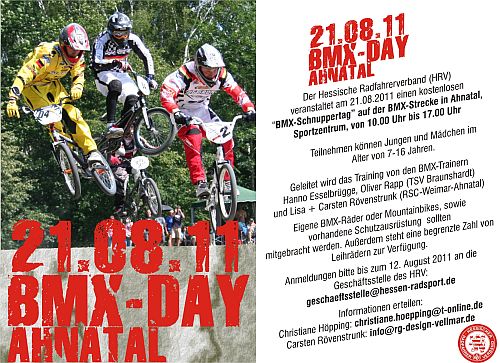 Am 21.08.2011 findet der 1. Ahnataler "BMX-Day" für Jungen und Mädchen im Alter von 7-16 Jahren statt! Anmeldungen können bis zum 16. August an folgende Adressen gemeldet werden: