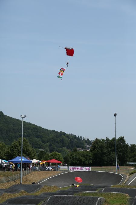 Der BDR war außerdem vertreten mit einem Informationsstand, sowie dem Deutschen Fahrrad-Trial Meister Raphael Pils, der eindrucksvoll die von der Busse-Logistik bereitgestellten Palettentürme und einen Überseecontainer des RSC unter die Räder nahm. Gespannt wartete man bereits auf die Flaggen der Bundesländer, die von vier Fallschirmspringern der Aero-Fallschirmsport GmbH aus Calden eingeflogen wurden, vorher konnte Ahnatals Bürgermeister Michael Aufenanger noch einige Worte an die zahlreichen Zuschauer,