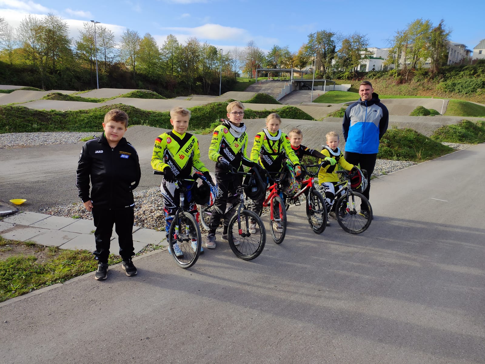 Für alle ein erstmaliges Erlebnis und daher war die Aufregung für Janne Wagner, Jolina Golisch, Erik Finis, Jonas Mavrin und Bosse Schmidts groß. Nach der Lösung technischer Herausforderungen an dem Fahrrad eines Teilnehmers, konnte es dann auch fast pünktlich losgehen. Vor Ort stieß mit Jonah Spang noch ein weiterer hessischer Fahrer (TSV-Braunshardt) mit hinzu und die Trainingsessions konnten auf der ungewohnten Bahn unter Trainer Daniel Schlang beginnen. Alle Teilnehmer haben mit großem Engagement teilgenommen und trotz doch bereits kälteren Wetters und immer wieder kleinerer Regenschauer, gab es keinen, der auch nur im Ansatz sich darüber beschwert hätte. Fortschritte waren laut Daniel Schlang ebenfalls zu verzeichnen: Sei es der Manual, das Springen diverser Hindernisse oder gar das hinunterfahren des 8-Meter Supercross Starthügels.