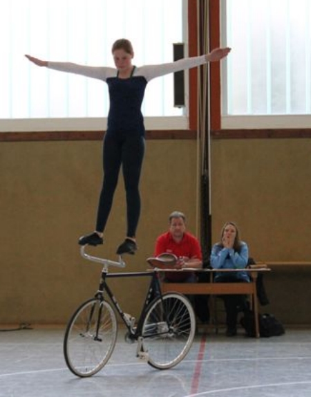 Ihren ersten Start in der U13 hatte Sophie Simon. Nachdem sie bei der Vereinsmeisterschaft bereits ein gutes Ergebnis vorgelegt hatte, waren alle auf die Bezirksmeisterschaft gespannt. Der Frontlenkerstand, der ihr in der Vorwoche noch Probleme bereitet hatte, gelang. Beim Übergang zum Steuerrohrsteiger war es umgekehrt: Den hatte Sophie bei der Vereinsmeisterschaft spielend gemeistert, bei der Bezirksmeisterschaft musste sie das Rad verlassen und konnte deshalb die Folgeübungen nicht fahren. Mit einem Endergebnis von 52,40 Punkten löste sie trotzdem ihr Ticket zur Hessenmeisterschaft und gewann die Bronzemedaille.