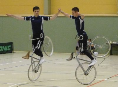 Bei den Zweier Frauen zeigten die Nationalfahrerinnen Tabea und Louisa Saamen (Liemer RC), wie ästhetisch schön Kunstradfahren auf höchstem Niveau sein kann. Im Zweier Kunstfahren offene Klasse bewiesen die zweifachen Vize-Weltmeister Florian und Felix Blümmel (Böhl-Iggelheim), dass sie nach dem verpassten WM-Ticket im letzten Jahr wieder ganz oben stehen wollen: Mit 146,14 Punkten erzielten sie nicht nur eine persönliche Bestmarke, sondern fuhren sogar die Weltjahresbestleistung heraus. Beim Start der Weltmeisterin im Einer Frauen Corinna Hein (Mörfelden) wurde es plötzlich mucksmäuschenstill in der Sporthalle. Routiniert spulte die Weltrekordinhaberin ihre Übungen ab und wurde ebenfalls mit einer Weltjahresbestleistung belohnt. Kein Wunder, dass die sympathische Athletin nach ihrem Start von den Kindern umringt wurde, die alle ein Autogramm haben wollten und es natürlich auch bekamen. Absolute Ruhe herrschte auch beim letzten Starter, Simon Puls (Liemer RC) im Einer Kunstfahren Männer. Nach längerer Verletzungspause verzauberte der Nationalfahrer mit Handständen auf dem fahrenden Rad und zeigte den Drehsprung taktisch aufgewertet mit sechs Umdrehungen. Eine rundum gelungene Veranstaltung, bei der garantiert alle auf ihre Kosten gekommen sind. Hier die Ergebnislisten!