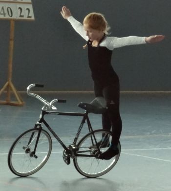 Pauline Bischoff zeigte eigentlich ein ganz ordentliches Programm – in der Aufregung vergaß sie aber den Sattellenkerstand in der Wechselrunde, ihre höchste Übung, die sie sicher beherrscht. Besonders wichtig war bei Pauline, dass das Anfahren von rückwärts nach vorwärts klappt, und das ist ihr auch gelungen. Durch die Auslassung verpasste sie zwar eine neue Bestleistung, mit 39,35 Punkten durfte sie aber immerhin den Bezirkspokal der Schülerinnen B in Empfang nehmen.
