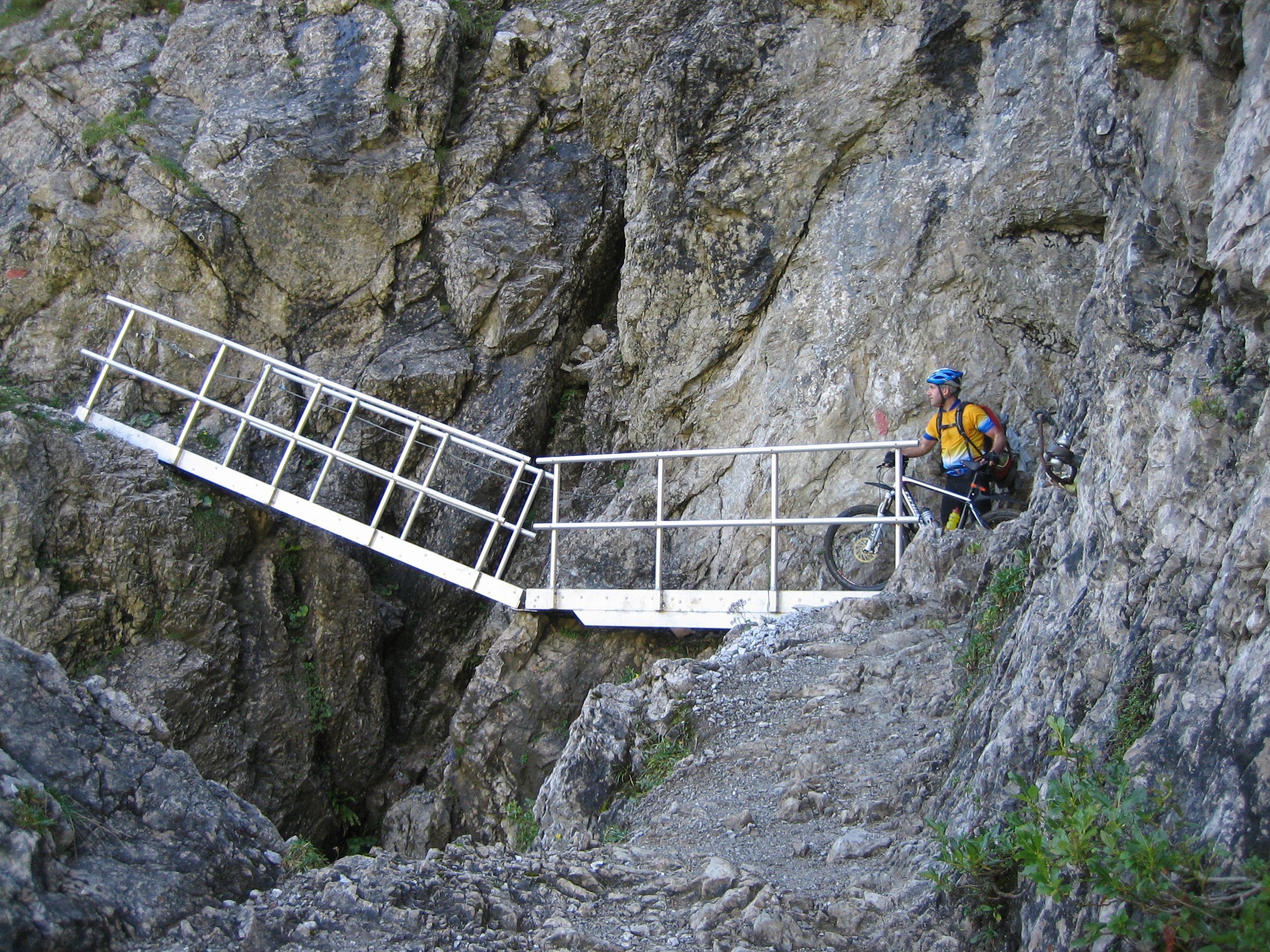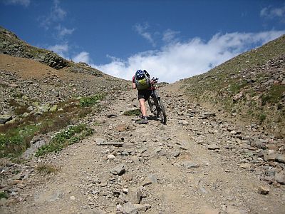 Der dritte Tag begann mit dem Aufstieg durch das Fimbertal. Zuerst steil auf Asphalt, später sanfter ansteigend auf Schotter zog sich die Piste durch das einsame Hochtal unterhalb des imposanten Fluchthorns. Nach Überquerung der Schweizer Grenze und Erfrischung in der Heidelberger Hütte musste noch eine gute Stunde bis zum Fimberpass geschoben und getragen werden. Dann folgten 1.600 Höhenmeter am Stück Abfahrt hinunter an den jungen Inn. Ab da hieß es gleich wieder kurbeln und zwar hinauf zur spektakulären Uina-Schlucht. Ab hier war wieder Schieben und Tragen angesagt, bestand der Pfad doch lediglich aus einer rund einen Meter breiten in den senkrechten Fels geschlagenen Röhre. Nach dieser bestandenen Mutprobe konnte auch das kleine Gewitter am Schlinigpass die beiden Mountainbiker nicht aus der Fassung bringen. Das Nachtquartier in Schlinig bot würzig-frische Almluft und Südtiroler Leckereien.